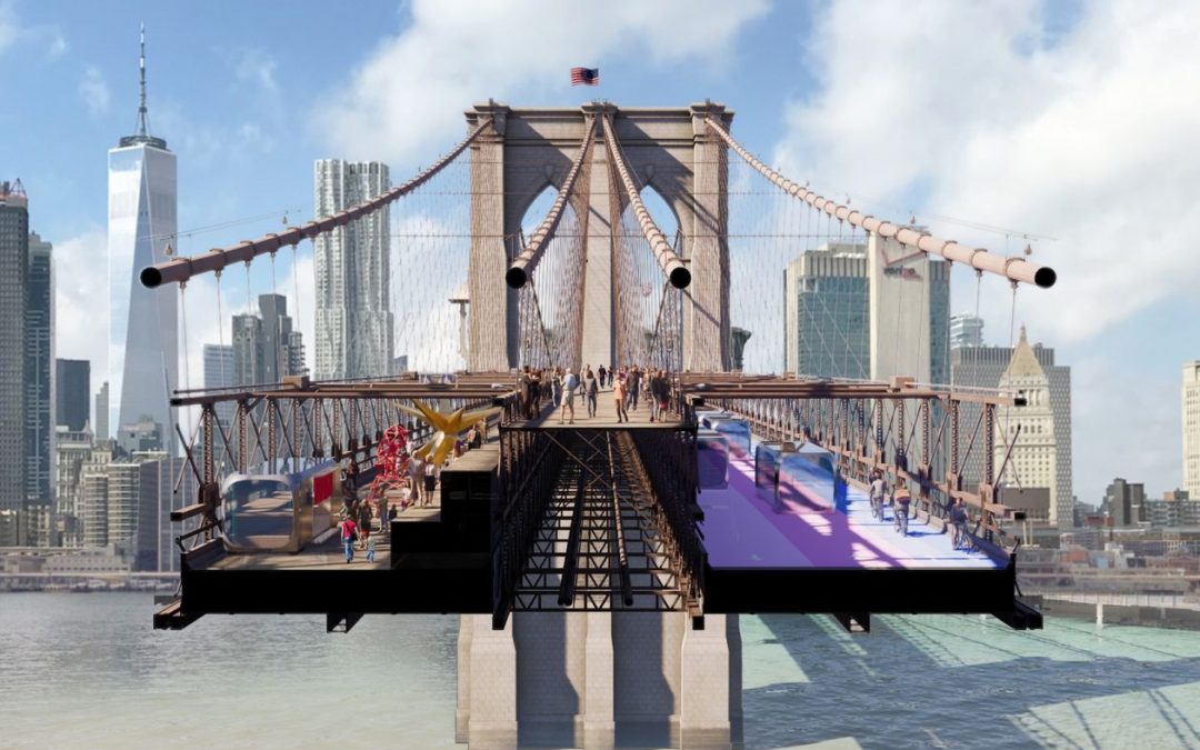 Finalists in a competition to improve the crowded Brooklyn Bridge experience for pedestrians and cyclists are proposing a new glass walkway, “microforests” at either end and even car bans.